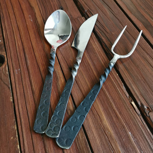 Geschmiedete Mittelalter Besteck Set. Messer, Gabel, Löffel