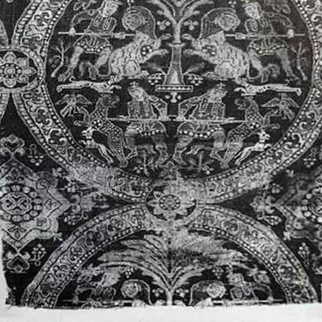 - Dieses Muster war zweifellos zu Beginn des Mittelalters sehr beliebt: Es wurde tatsächlich bei archäologischen Ausgrabungen Fragmente dieses Brokats in Skandinavien an der Wikingerstätte Oseberg gefunden.