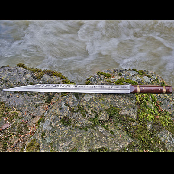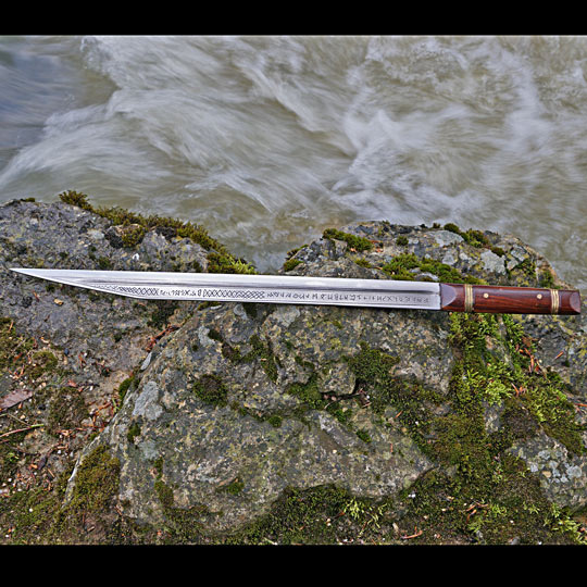• Die Klinge ist aufwendig graviert und mit einer runischen Inschrift versehen, wobei der erste Teildas angelsächsiche Futhorc (= Alphabet) wiedergibt.